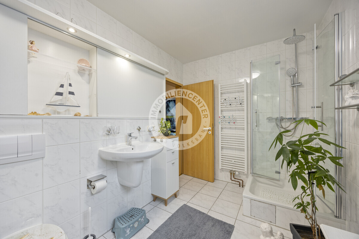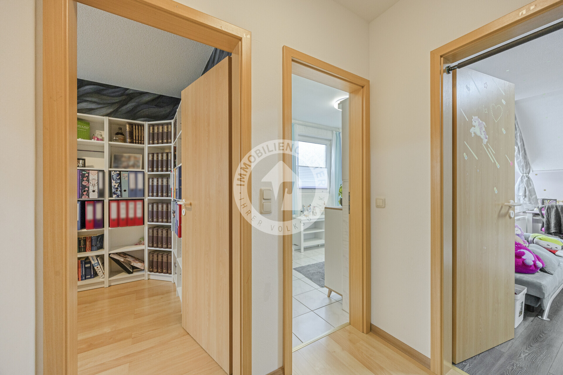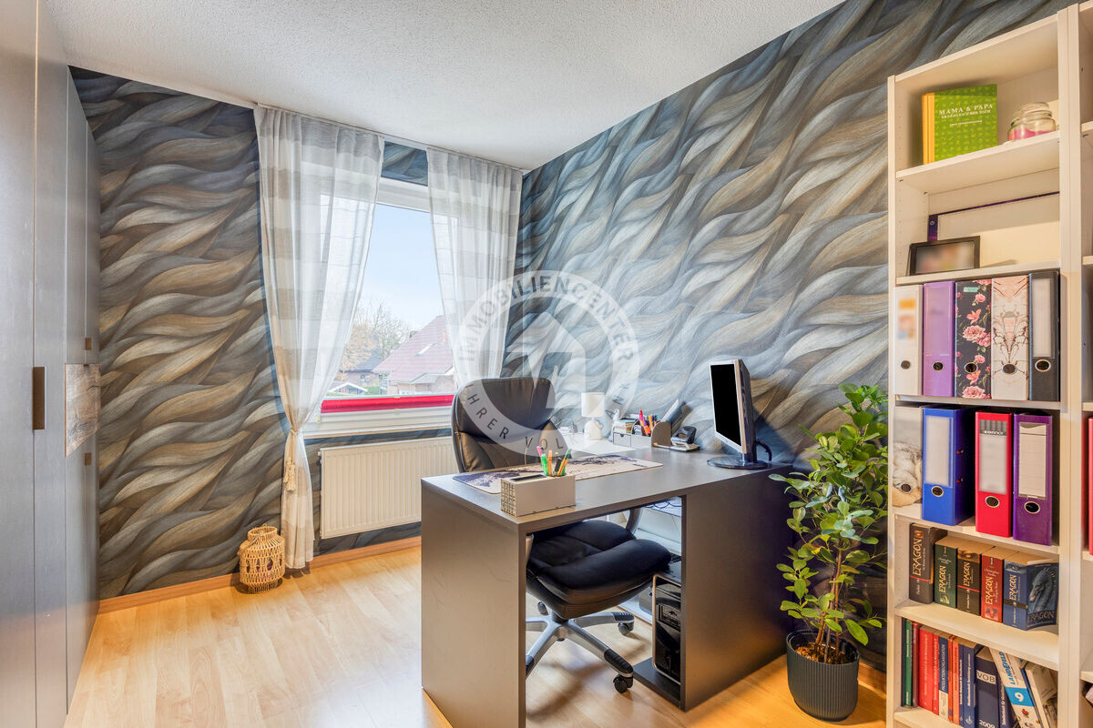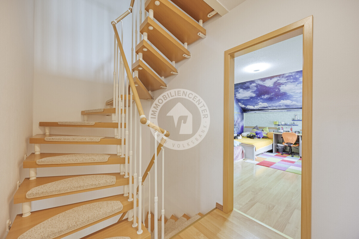 Im Obergeschoss finden Sie zwei Kinderzimmer, ein Arbeitszimmer sowie ein hell gefliestes Tageslichtbad mit Badewanne und Dusche.