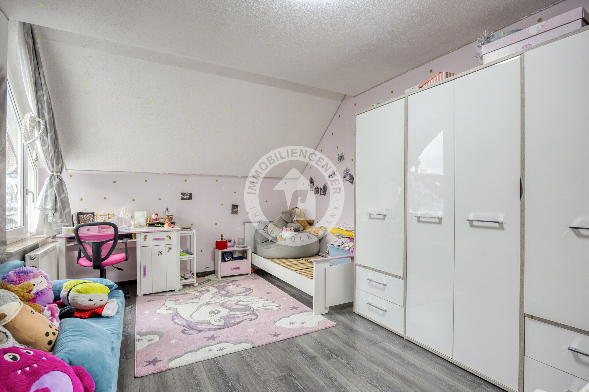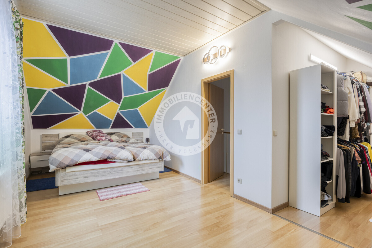 Das großzügig geschnittene Elternschlafzimmer mit begehbarem Kleiderschrank sowie ein Technikraum im Dachgeschoss runden unser Angebot ab.
