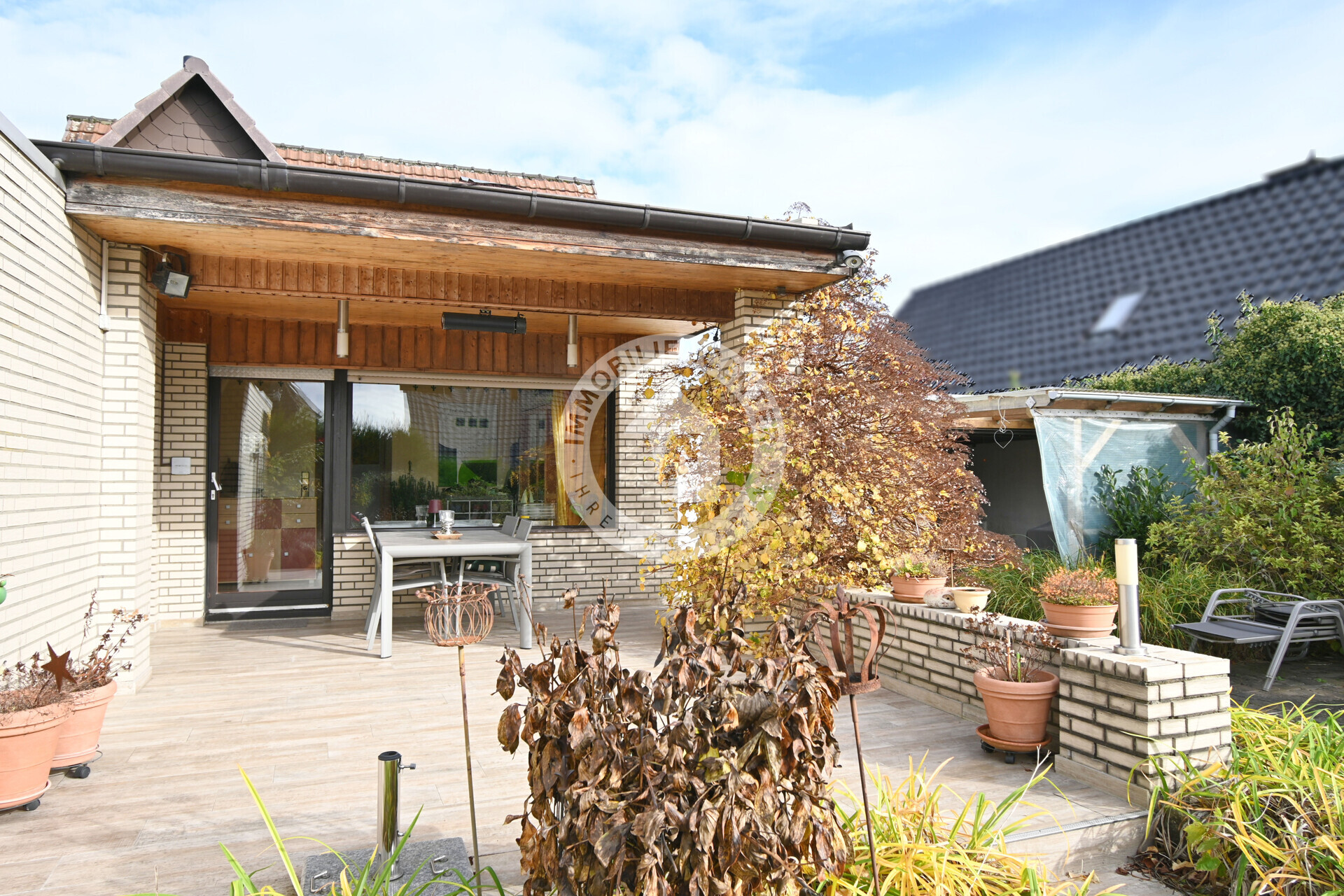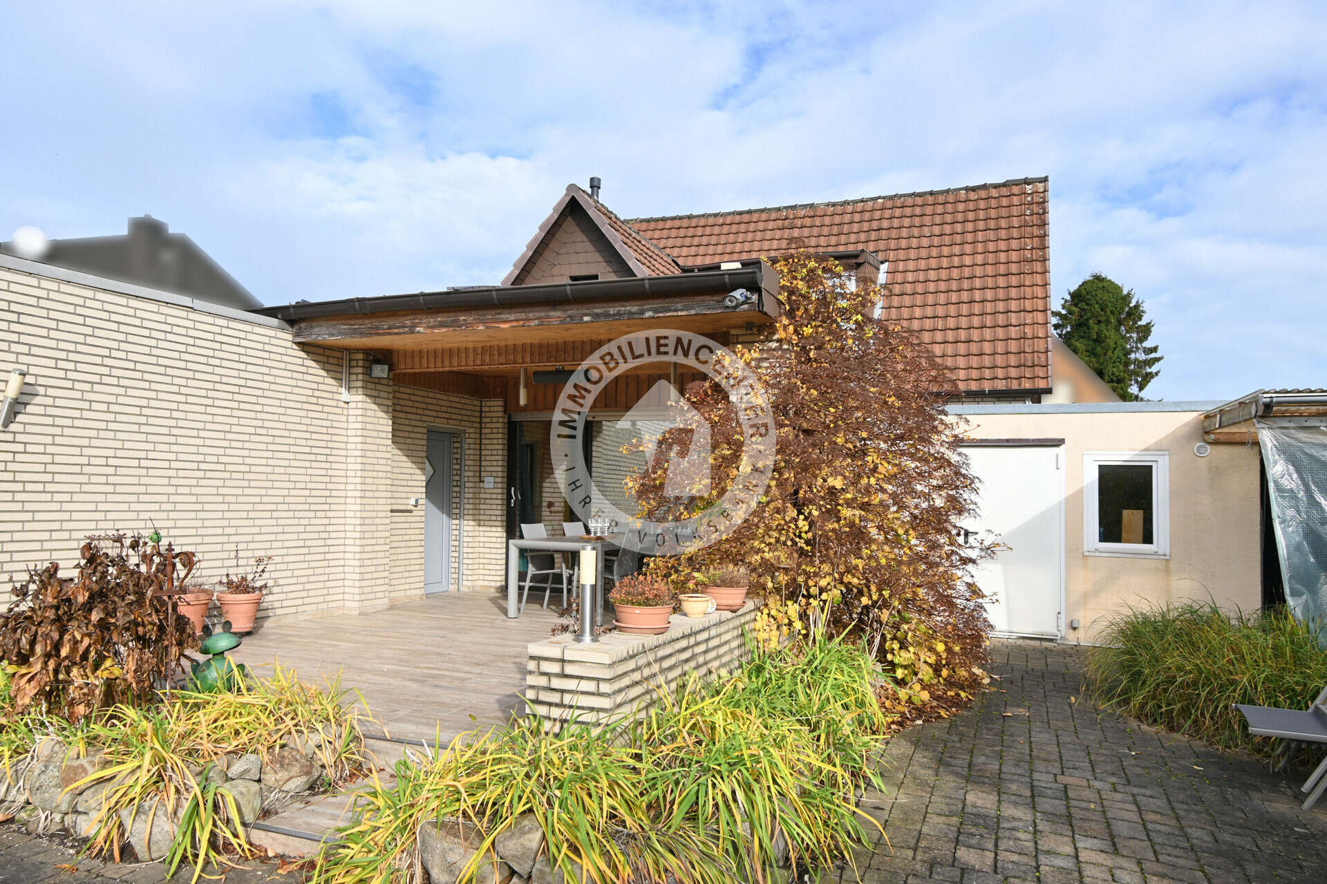Genießen Sie den pflegeleicht angelegten Garten und entspannte Stunden auf der überdachten Terrasse. Neben der Garage gibt es einen Abstellraum, eine zweite Garage liegt auf der anderen Hausseite. Vor beiden Garagen stehen weitere Parkmöglichkeiten bereit.