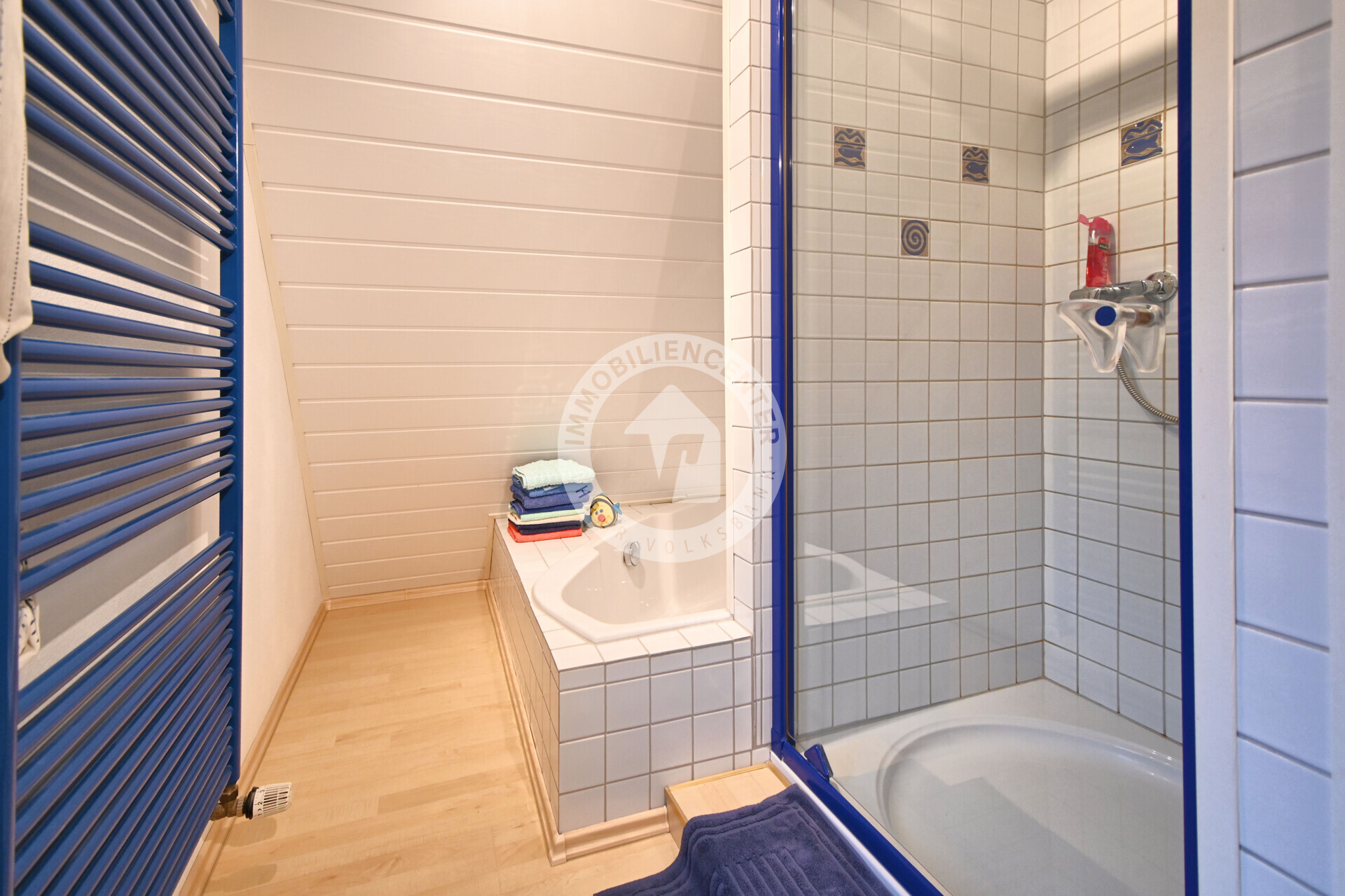 Im Dachgeschoss befinden sich das Schlafzimmer und ein weiteres Bad mit Dusche, Eckbadewanne und zusätzlichem Waschmaschinenanschluss. Ihre Wäsche können Sie hier bequem neben der Heizungsanlage trocknen.