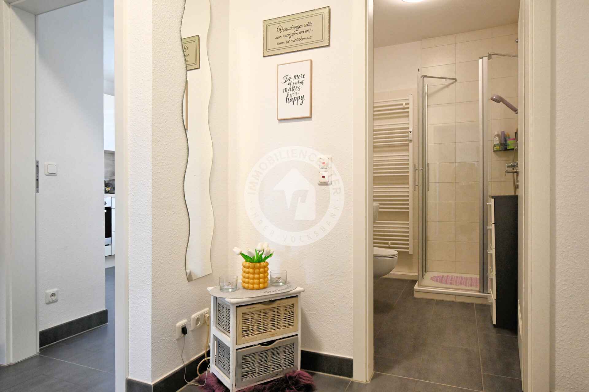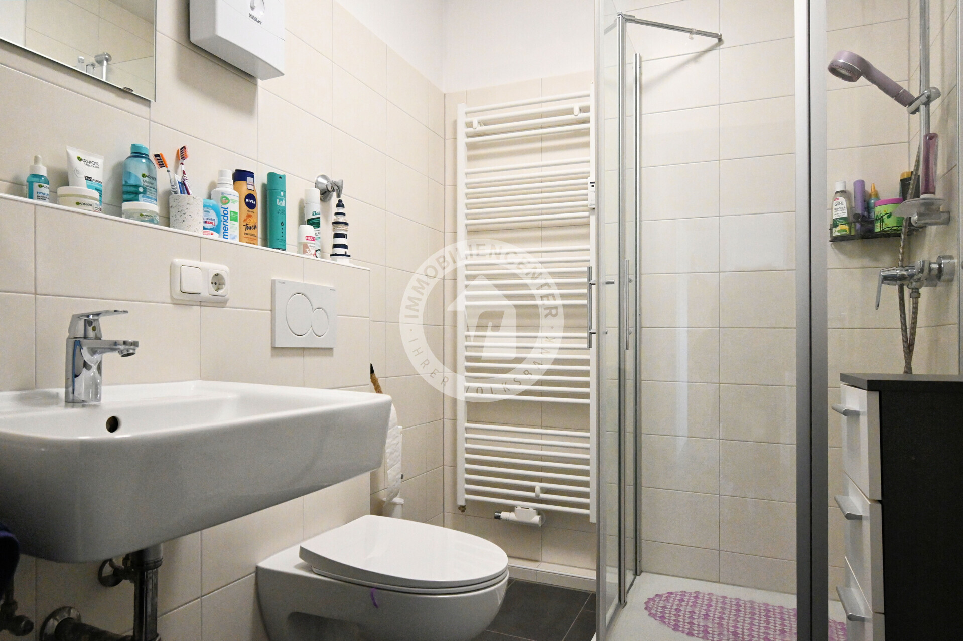 Das moderne Badezimmer ist mit einer komfortablen, ebenerdigen Dusche ausgestattet und unterstreicht den gepflegten Zustand der Immobilie.