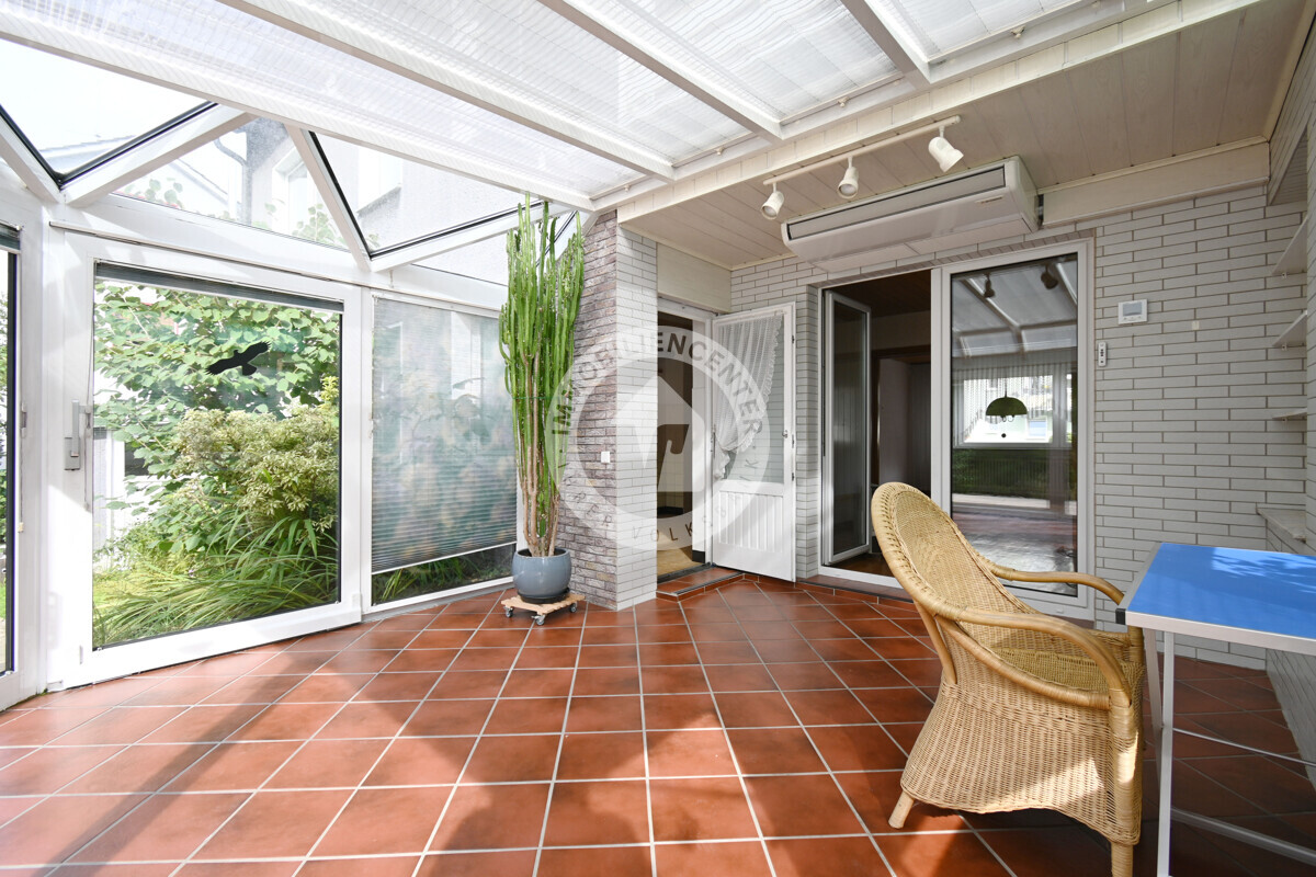 Im Erdgeschoss erwarten Sie ein weitläufiger Wohn-/Essbereich, eine danebenliegende Küche, ein vorgelagerter Wintergarten mit Beschattung und Klimaanlage, ein großzügiges Schlafzimmer, ein Kinderzimmer und ein Tageslichtbad mit Dusche.
