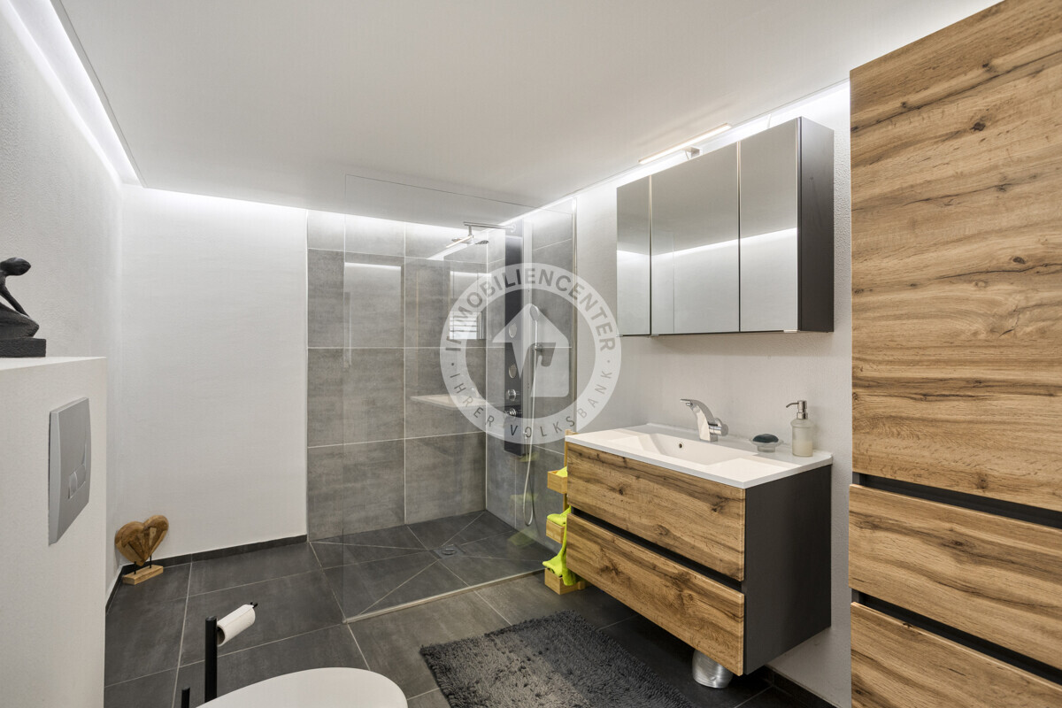 Auf derselben Ebene befindet sich das Badezimmer, das 2021 vollständig modernisiert wurde. Weiß verputzte Wände, hochwertige anthrazitfarbene Fliesen und eine bodentiefe Regendusche mit Glaswand sorgen hier für einen zeitgemäßen, frischen Look.
