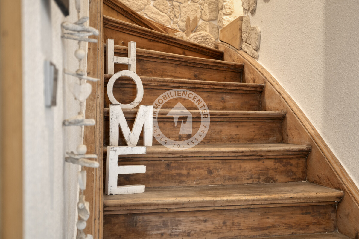 Die Original-Holztreppe aus dem Baujahr, sorgfältig abgeschliffen und gepflegt, führt Sie ins 1. Obergeschoss. Auf halber Höhe wurde zusätzlich ein praktischer, ausgebauter Raum geschaffen – optimal als Homeoffice, Leseecke oder kleiner Hobbybereich.