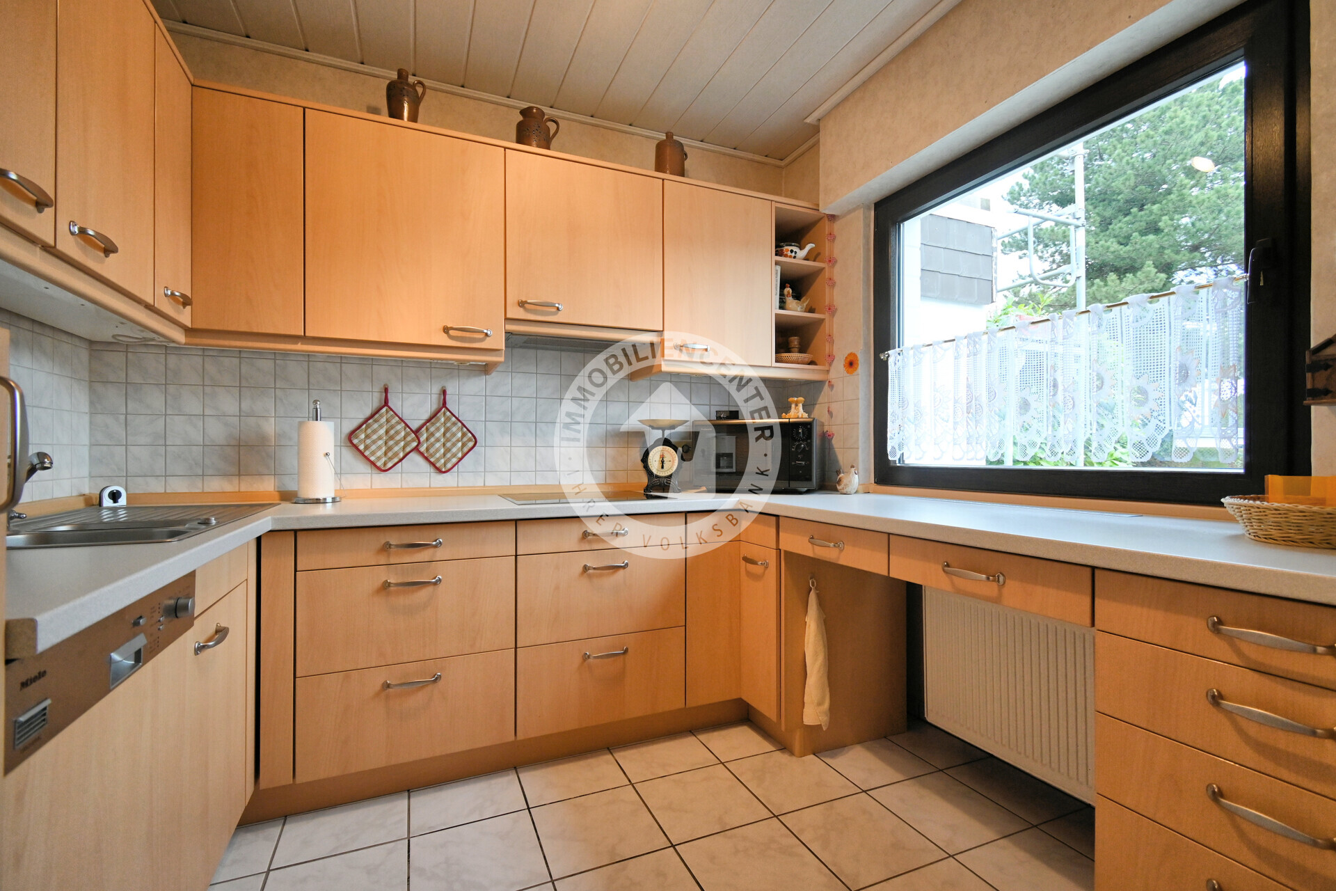 Die durchdachte Küche ist mit einer praktischen Einbauküche ausgestattet, die im Haus verbleibt und alle wichtigen Funktionen bereitstellt.