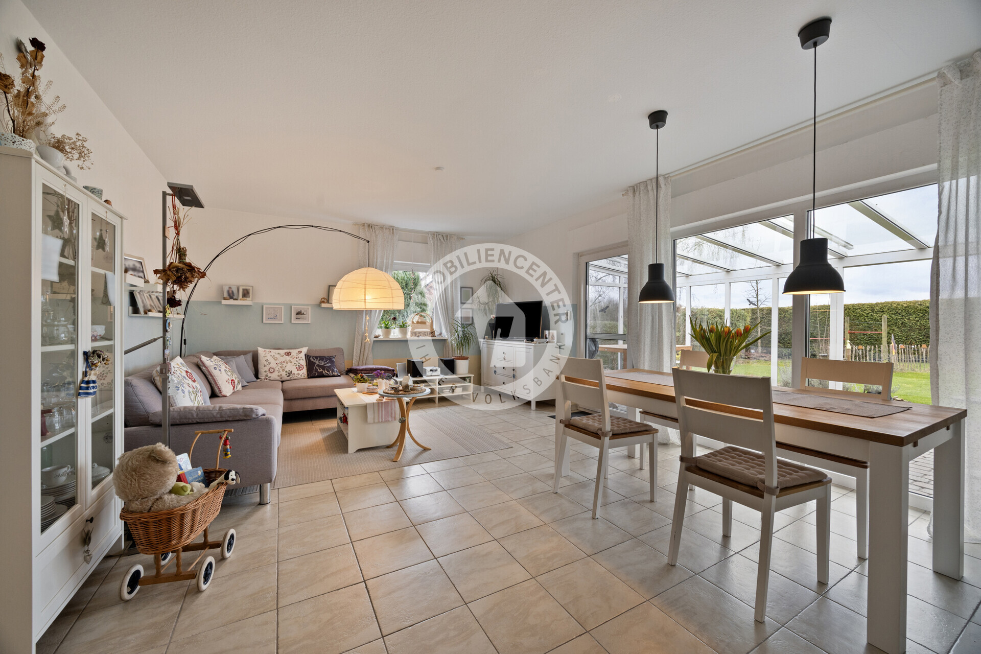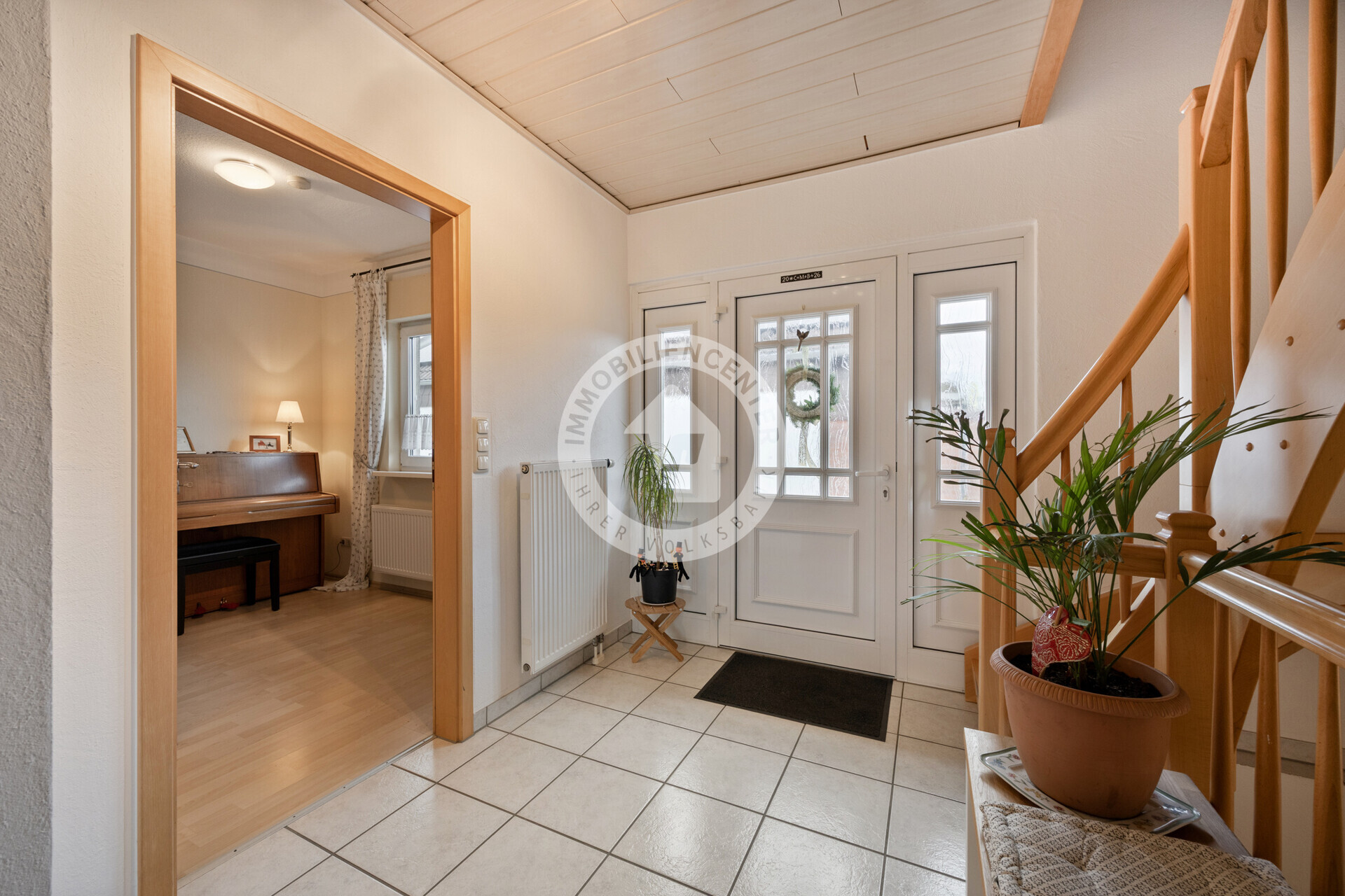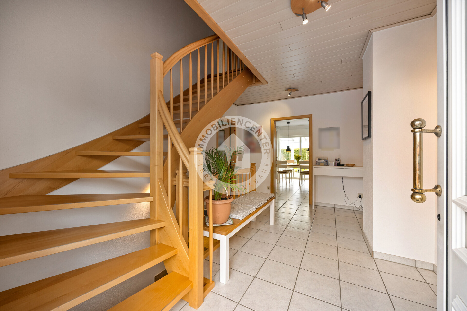 Der Eingangsbereich wirkt durch viel Licht besonders einladend, die stilvolle Holztreppe führt ins Dachgeschoss. Der großzügige Wohn‑ und Essbereich mit hellen Fliesen bietet viel Platz für gemeinsame Momente. Von hier gelangen Sie auf die überdachte, wintergartenähnliche Terrasse, die sich über die gesamte Hausbreite erstreckt. Der gepflegte Garten mit freiem Blick ins Feld lädt zum Entspannen ein – ideal für Kinder, Hobbygärtner und Ruhesuchende.