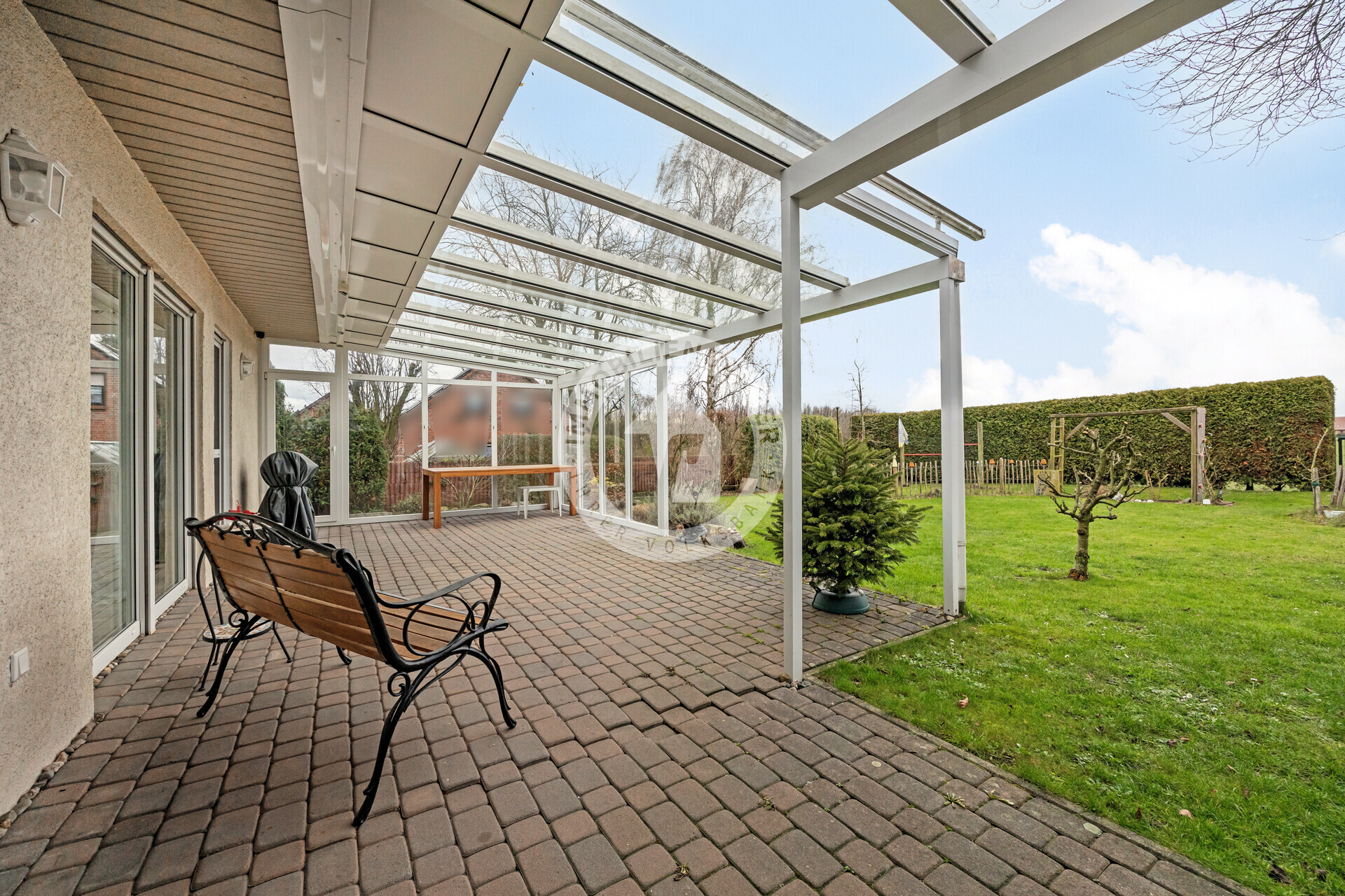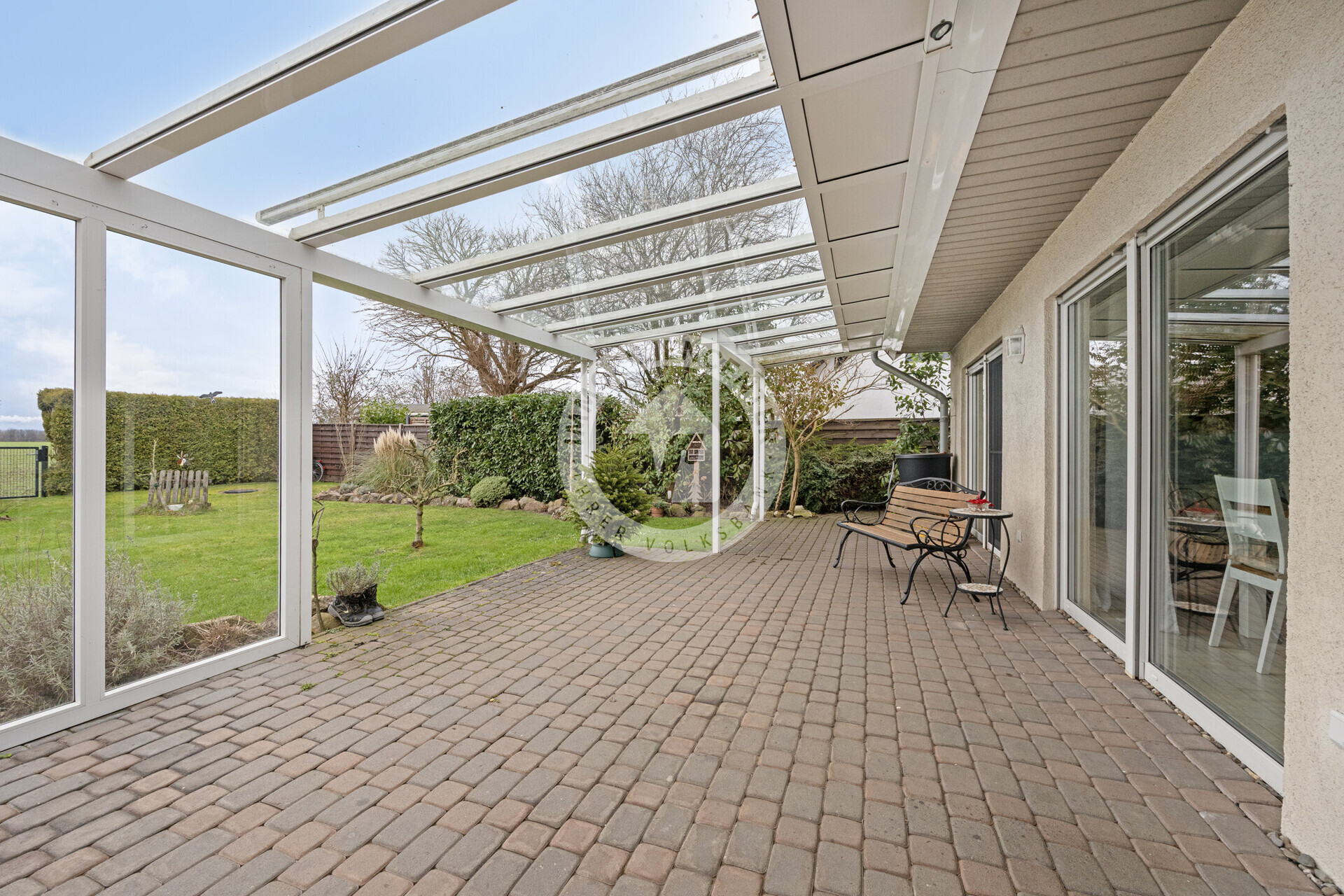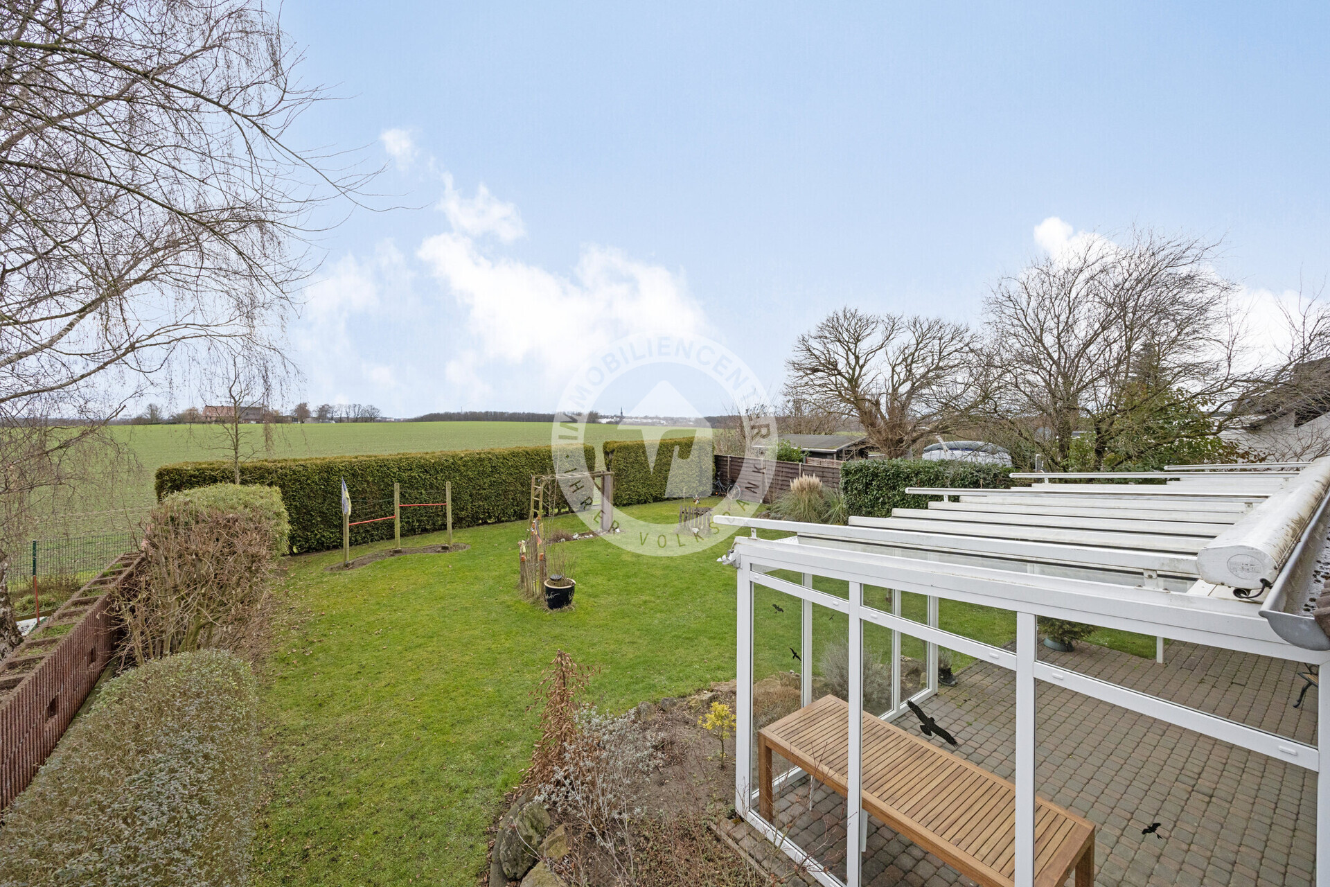 Der Eingangsbereich wirkt durch viel Licht besonders einladend, die stilvolle Holztreppe führt ins Dachgeschoss. Der großzügige Wohn‑ und Essbereich mit hellen Fliesen bietet viel Platz für gemeinsame Momente. Von hier gelangen Sie auf die überdachte, wintergartenähnliche Terrasse, die sich über die gesamte Hausbreite erstreckt. Der gepflegte Garten mit freiem Blick ins Feld lädt zum Entspannen ein – ideal für Kinder, Hobbygärtner und Ruhesuchende.