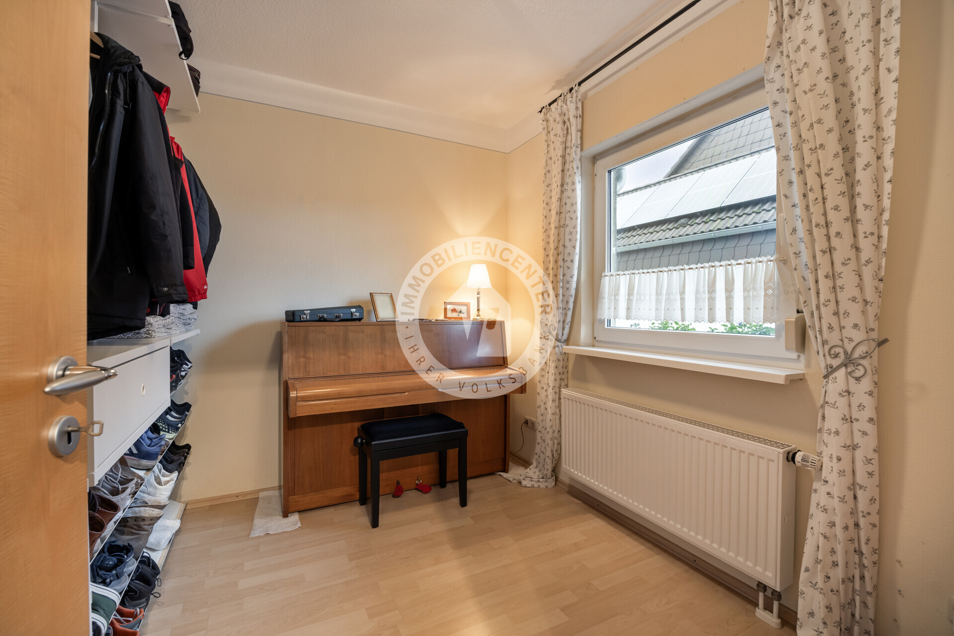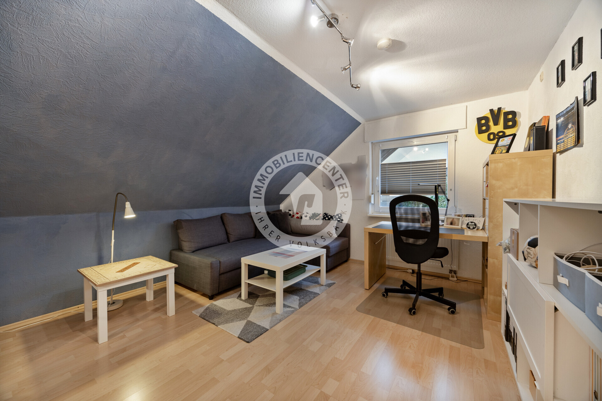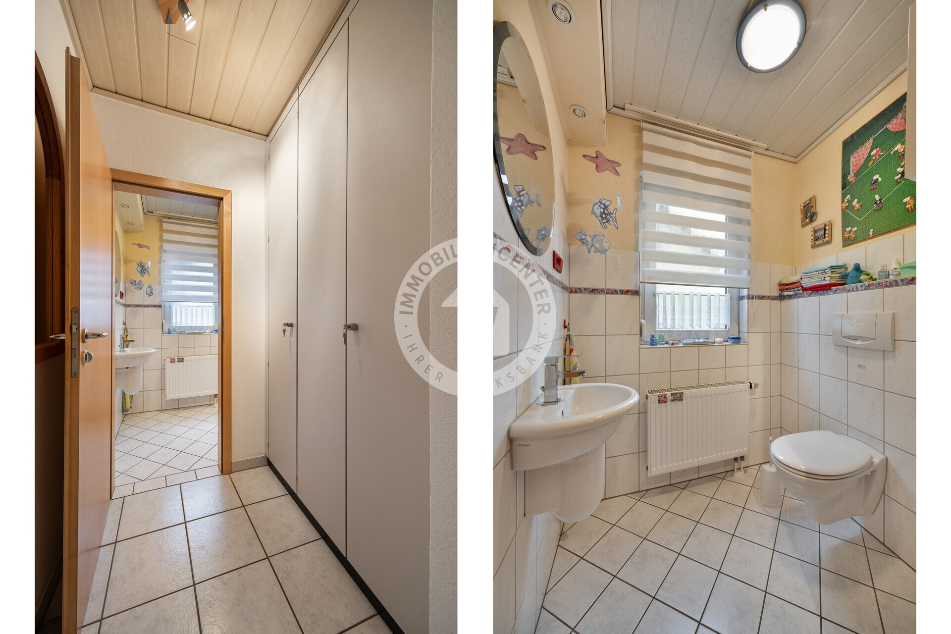 Ein zusätzliches Zimmer mit Terrassenzugang bietet flexible Nutzungsmöglichkeiten, etwa als Gästezimmer, Büro oder Spielzimmer. Die große Küche mit gemütlichem Essplatz schafft Raum für gemeinsames Kochen und Familienleben. Ein Büro und ein Gäste‑WC mit Fenster sowie praktische Einbauschränke im Flur ergänzen das Erdgeschoss.