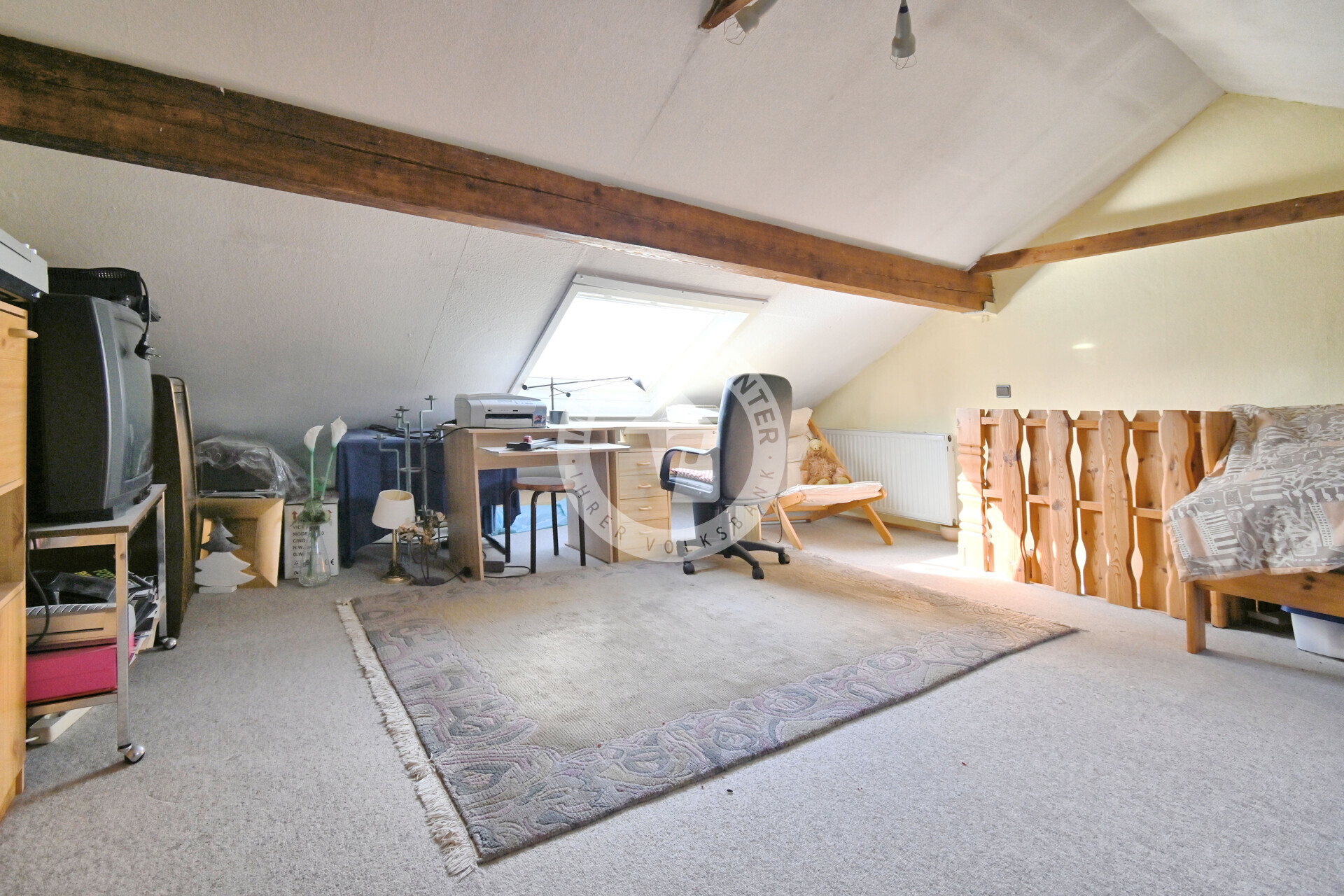 Im Erdgeschoss gelangen Sie über den Flur in die Küche sowie in das gemütliche Wohnzimmer, das durch den Wintergarten aus dem Jahr 2009 erweitert wird und einen schönen Blick in den Garten eröffnet. Das Obergeschoss verfügt über ein Tageslichtbad mit Badewanne, ein Schlafzimmer und ein Kinderzimmer. Eine feste Stiege führt weiter in den ausgebauten, beheizten Spitzboden, der dank zweier Kunststoff-Dachfenster vielseitige Nutzungsmöglichkeiten bietet.