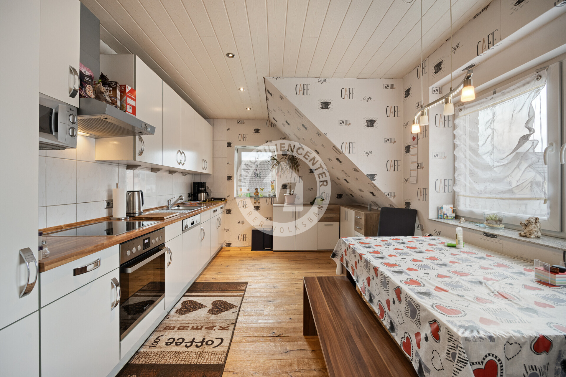 Die Dachgeschosswohnung bietet rd. 87 m² und ein helles, großzügiges Wohngefühl. Ein offener Wohn- und Essbereich mit großen Fenstern prägt die Wohnung. Die Küche mit integrierter Sitzecke ist lichtdurchflutet und praktisch gestaltet. Zwei gut geschnittene Schlafzimmer eignen sich flexibel für Familie, Gäste oder Homeoffice. Zwei Tageslichtbäder – eines mit Badewanne, eines mit Dusche – sorgen für besonderen Komfort.