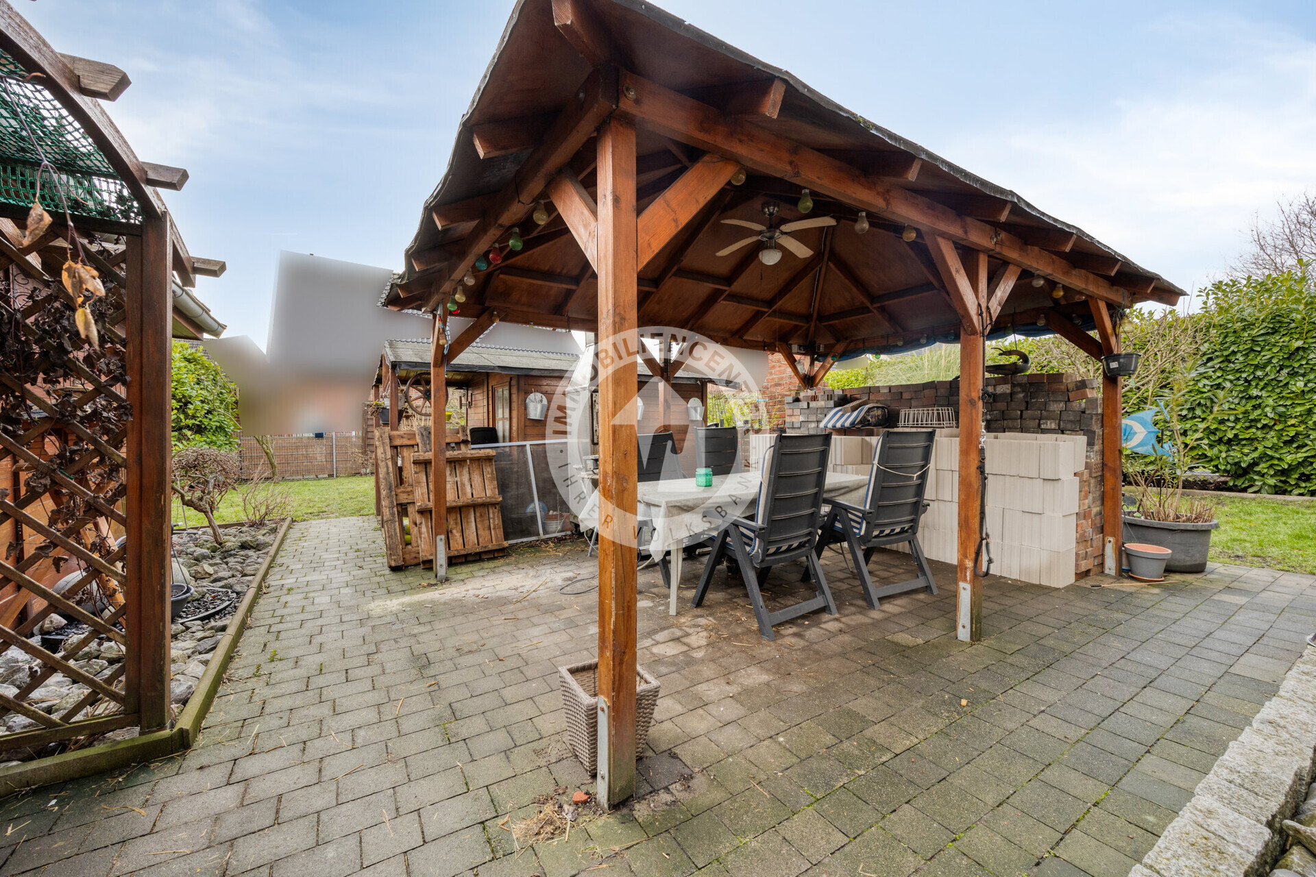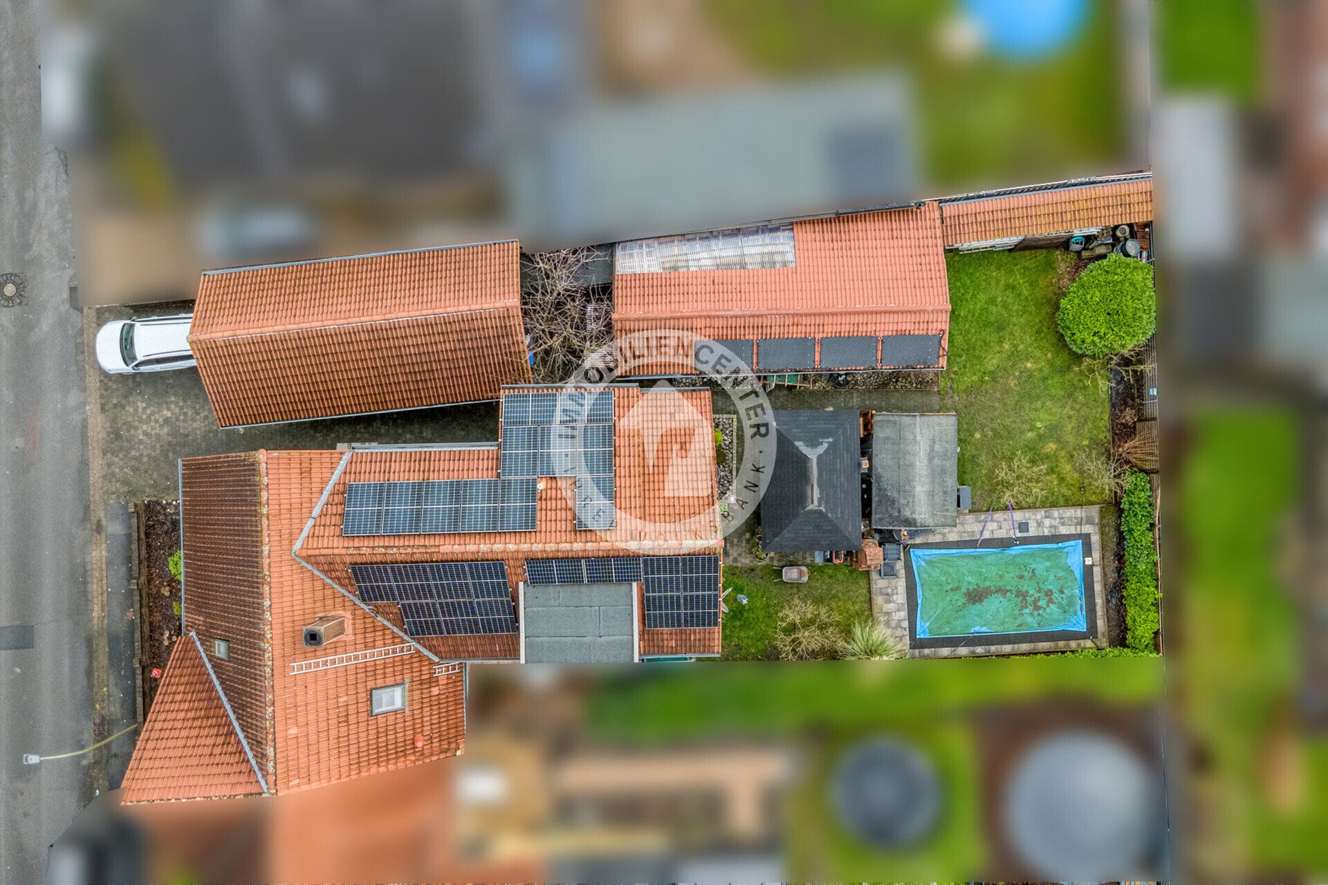 Das ca. 634 m² große, komplett eingefriedete Grundstück bietet viel Platz und Privatsphäre. Der gepflegte Garten mit Pool, zwei Terrassen sowie einer großen Garage mit Werkstatt rundet das Angebot ab.