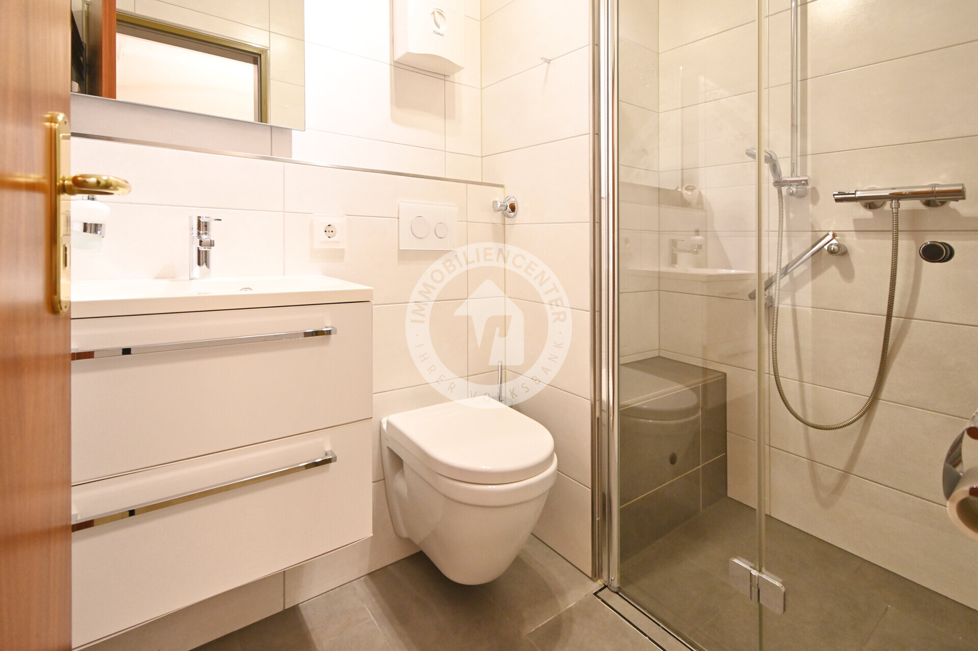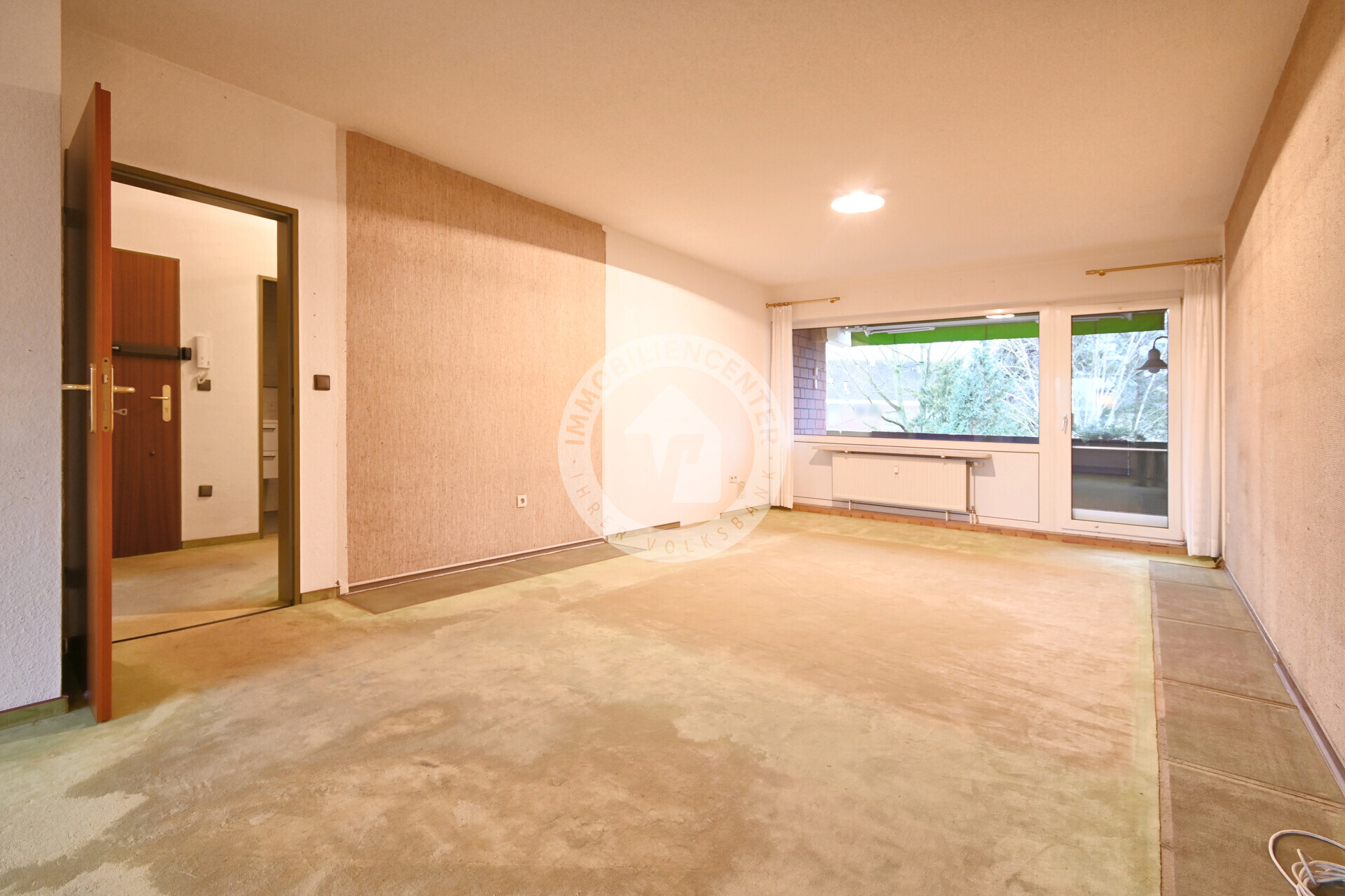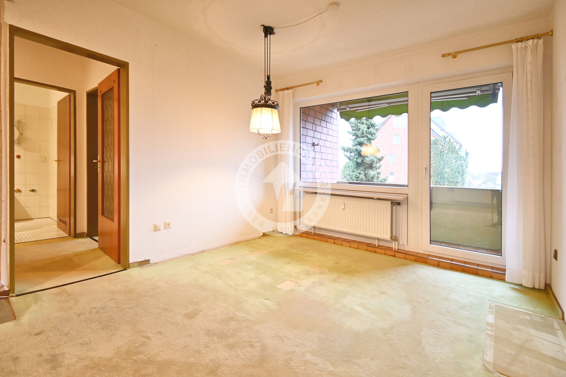 Der Eingangsbereich trennt den vorderen vom privaten Wohnbereich und bietet Zugang zu einem Schlaf‑ oder Arbeitszimmer, einem Badezimmer sowie der Küche. Mittelpunkt der Wohnung ist der offene Wohn‑ und Essbereich mit Zugang zu zwei Loggien mit Markisen, die für viel Licht und angenehme Stunden im Freien sorgen. Eine Loggia verfügt über einen praktischen Abstellraum.