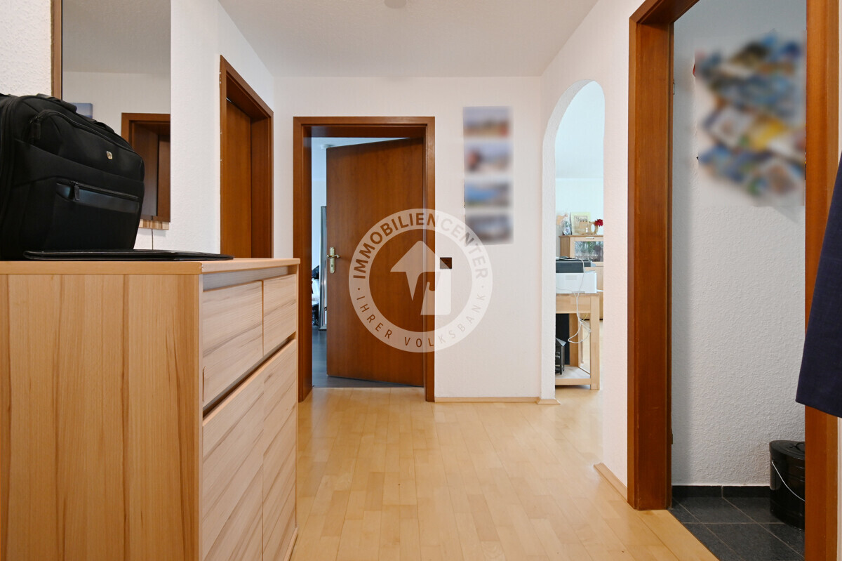 Die Wohnung überzeugt durch eine durchdachte Aufteilung: Vom großzügigen Flur aus sind alle Räume erreichbar – ein Gäste-WC, ein Badezimmer mit Dusche und Fenster, das Schlafzimmer, die Küche mit Blick zum Essbereich sowie das lichtdurchflutete Wohnzimmer mit Zugang zum sonnigen Südwest-Balkon.