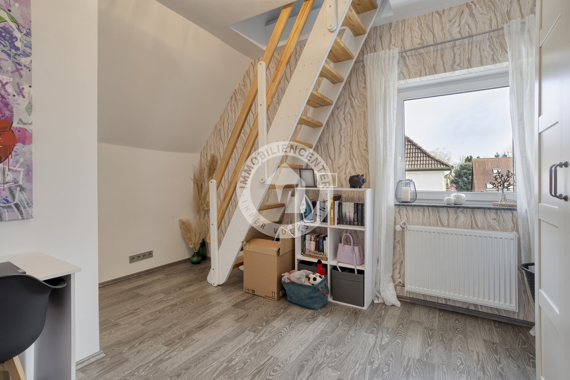 Das Obergeschoss beherbergt ein Schlafzimmer sowie ein separates Ankleidezimmer, das sich auch flexibel nutzen lässt. Über eine stabile Treppe erreichen Sie den Spitzboden. Hier gibt es weitere Nutzungs- und Lagermöglichkeiten. Abgerundet wird das Angebot durch einen modernisierten, professionell abgedichteten Keller.
