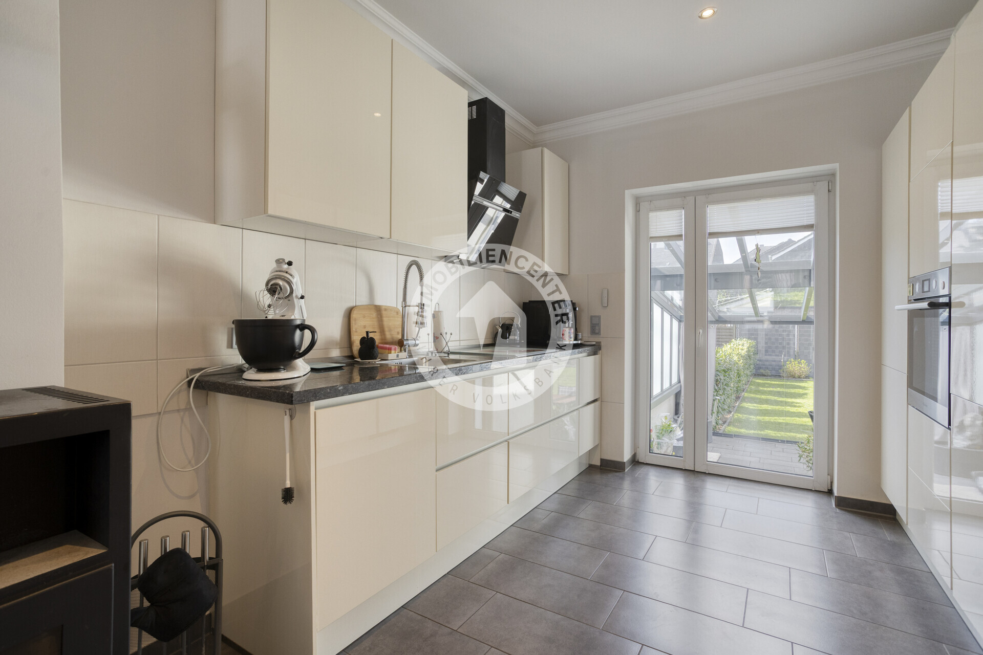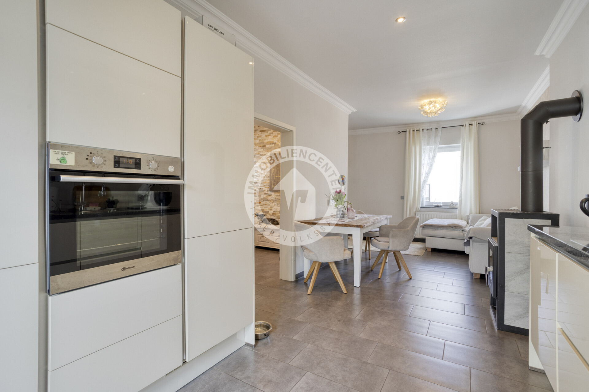Im Erdgeschoss empfängt Sie ein heller, einladender Eingangsbereich. Von hier aus gelangen Sie in den offenen Wohn- und Essbereich, der harmonisch in die moderne Küche übergeht. Ein gemütlicher Kamin sorgt für eine behagliche Atmosphäre. Die geschmackvollen Bodenfliesen unterstreichen das moderne Wohnkonzept. Vom Wohnbereich aus haben Sie direkten Zugang zum Garten sowie zum Wintergarten, die zusätzlichen Wohnkomfort und Erholungsqualität bieten. Ein Badezimmer mit Fenster und Badewanne rundet das Raumangebot auf dieser Ebene ab.