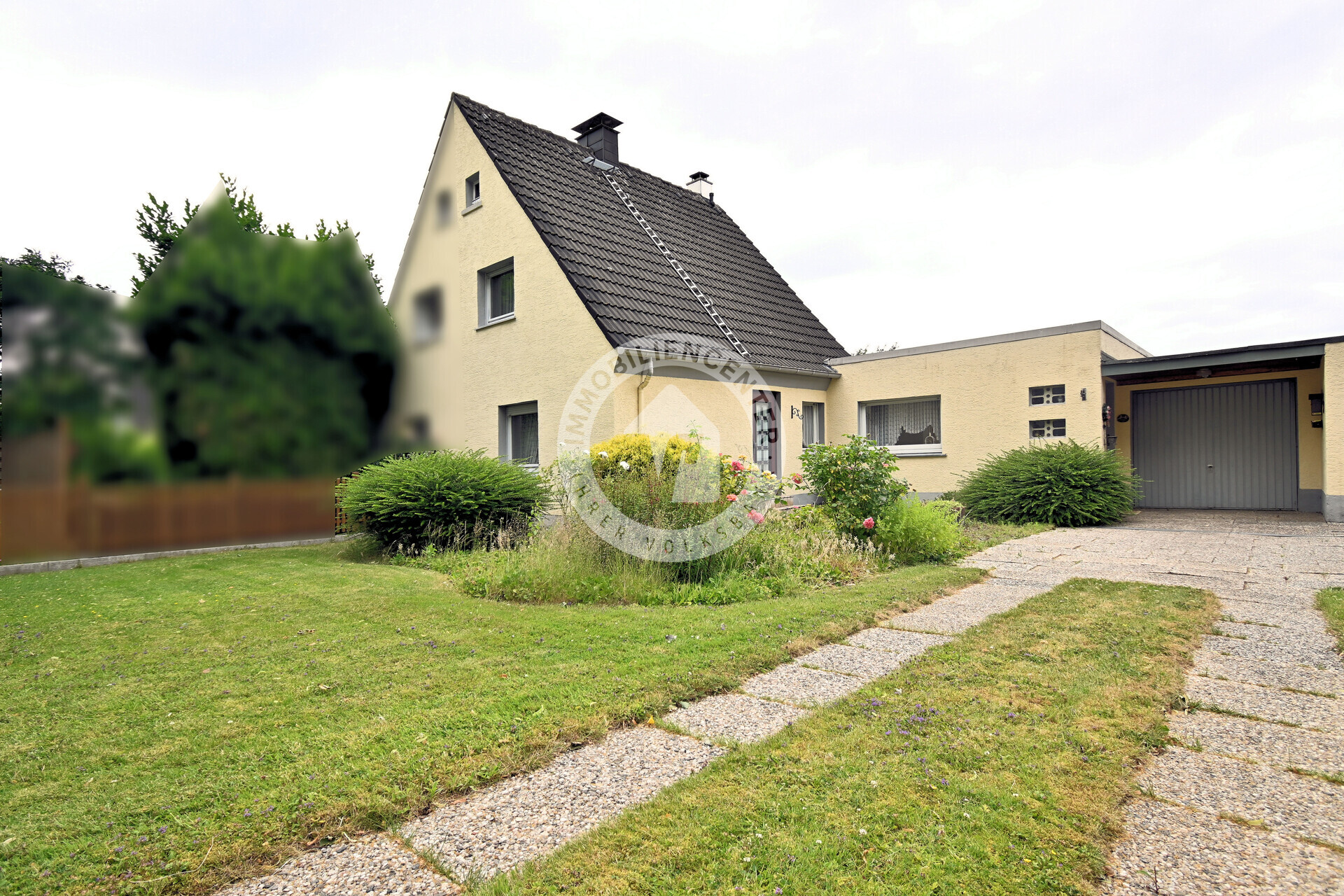 Über eine langgestreckte Einfahrt mit grünem Vorgarten gelangen Sie nicht nur zur Ihrem neuen Zuhause, sondern auch zur Garage mit elektrisch betriebenem Garagentor und direktem Durchgang in den gepflegten und sonnigen großen Garten mit Terrasse. Der Garten ist komplett eingezäunt.