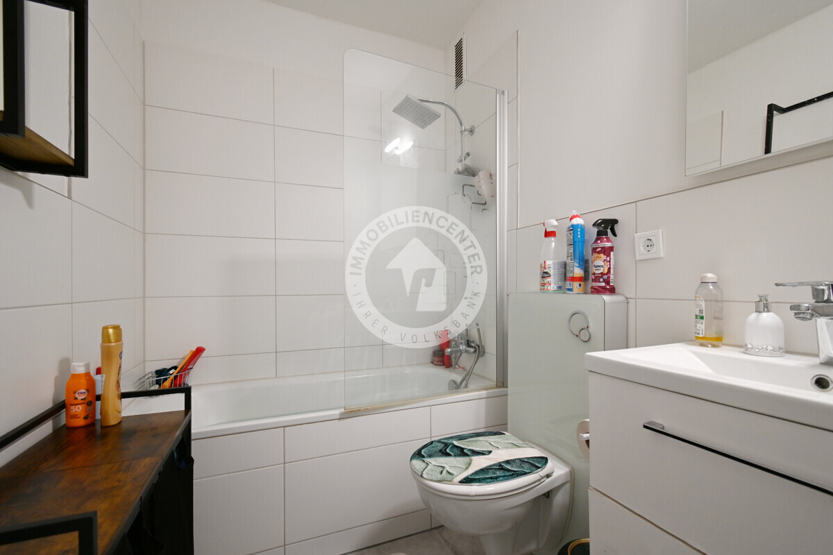 Das Badezimmer mit Badewanne sorgt für entspannte Wohlfühlmomente, während ein separates Gäste-WC zusätzlichen Komfort bietet. Praktisch ist auch der Abstellraum innerhalb der Wohnung, der über einen eigenen Wasseranschluss verfügt – so können Waschmaschine und Trockner bequem in der Wohnung betrieben werden.