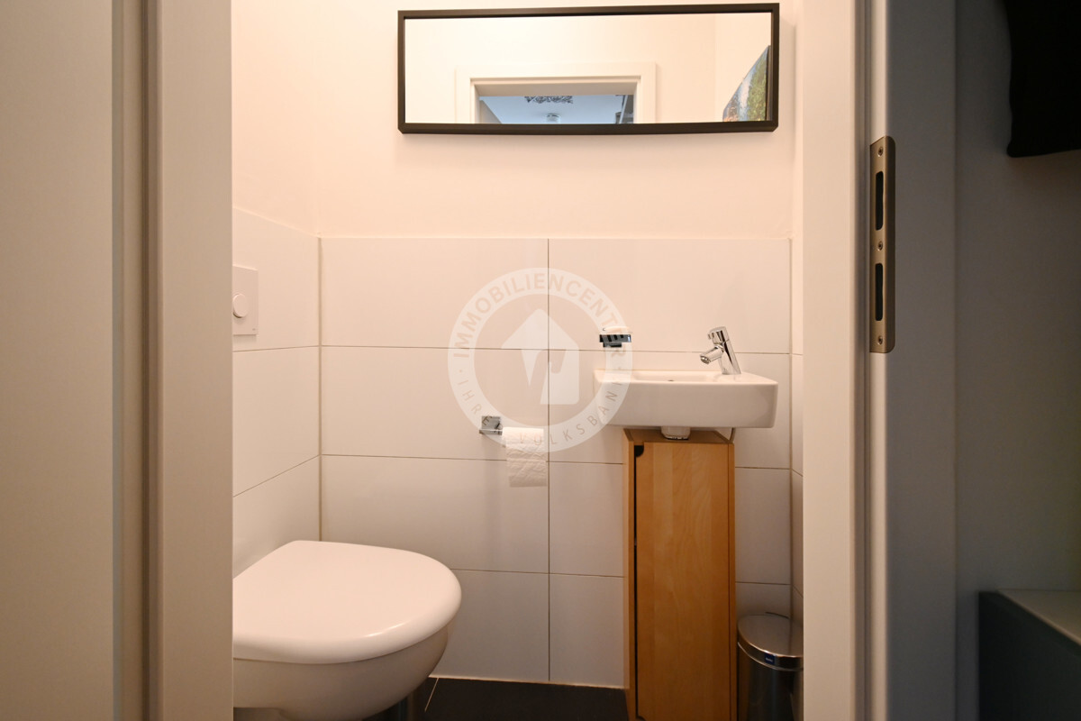 Das Hauptbadezimmer ist mit Dusche und Badewanne ausgestattet; ein separates Gäste-WC sorgt für zusätzlichen Komfort. In den Wohnräumen liegt hochwertiges Parkett, in den Bädern Fliesen. Eine Fußbodenheizung sorgt in allen Räumen für angenehmes Wohnklima.