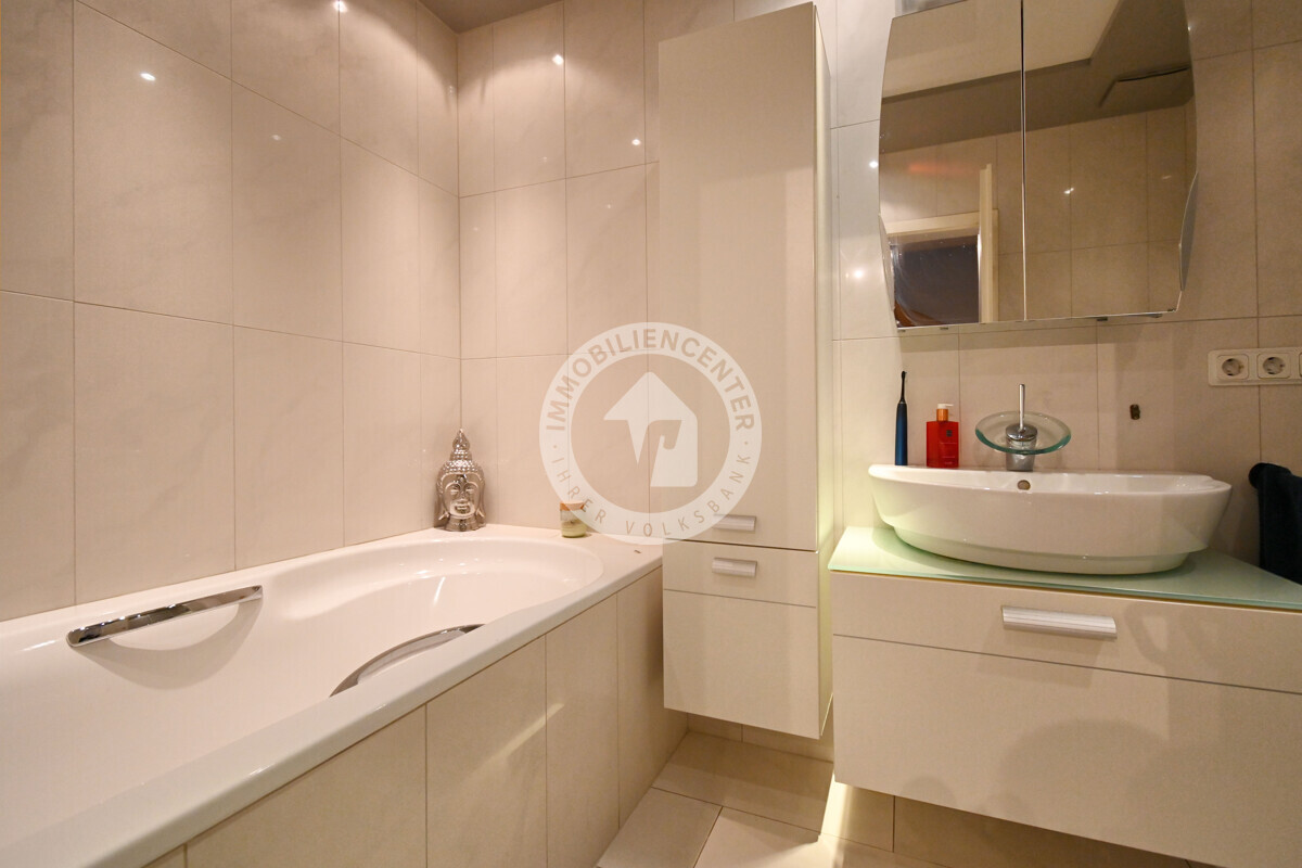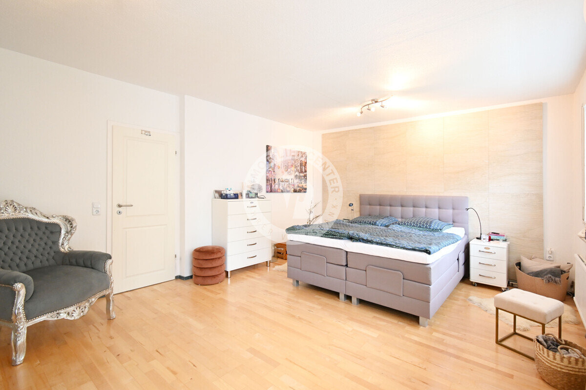 Das Obergeschoss bietet Ihnen ein modernes Badezimmer mit Badewanne sowie das Arbeitszimmer mit einer kleinen Bibliothek anbei. Zusätzlich ist das geräumige Schlafzimmer mit Zugang zum Balkon ein weiterer Rückzugsort, um dem Alltagsstress zu entfliehen. Das heutige Schlafzimmer waren damals zwei Zimmer. Es besteht also die Möglichkeit, je nach Bedarf, ein zusätzliches Zimmer zu gewinnen.