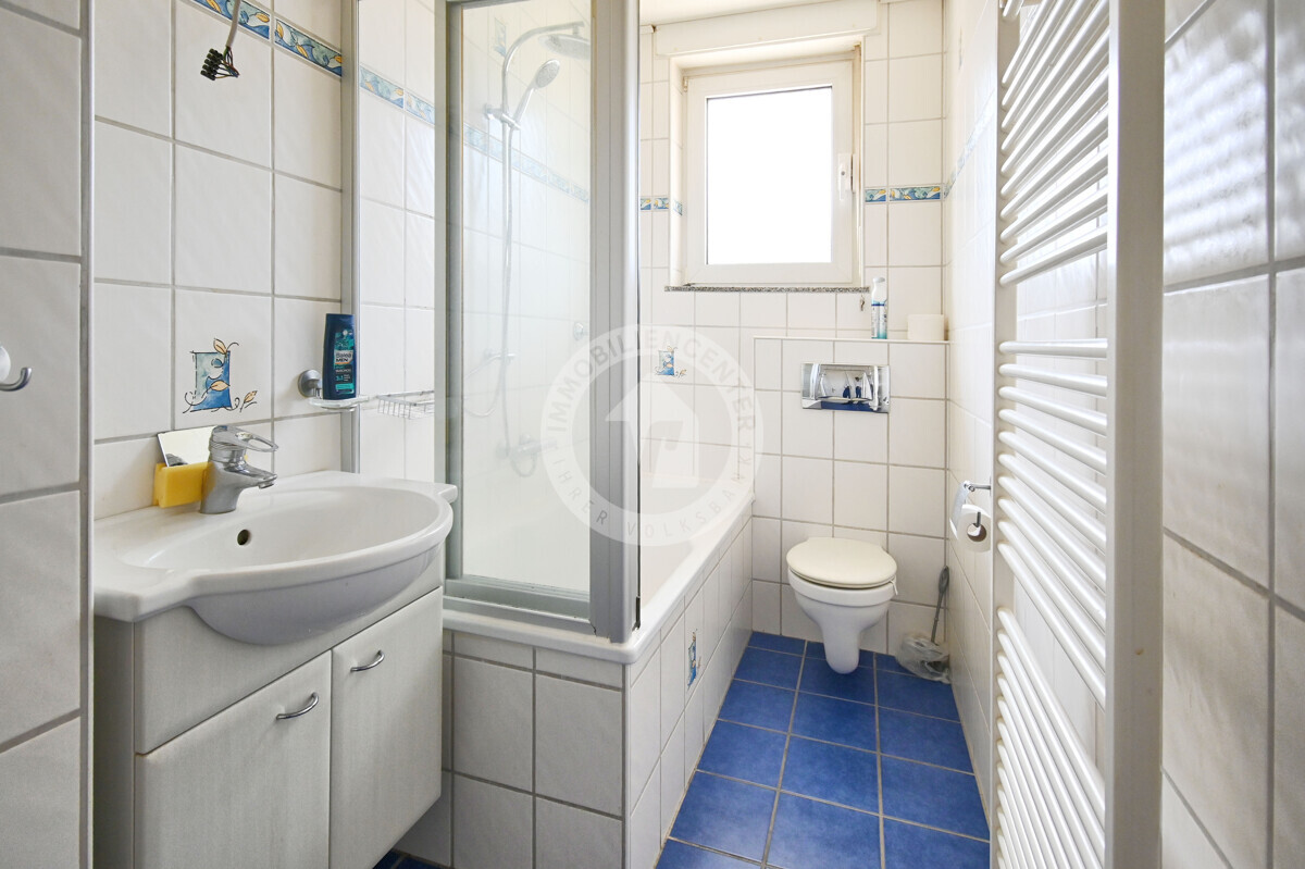 Geradeaus befindet sich das Badezimmer samt Duschwanne und Fenster, das für angenehmes Tageslicht sorgt.